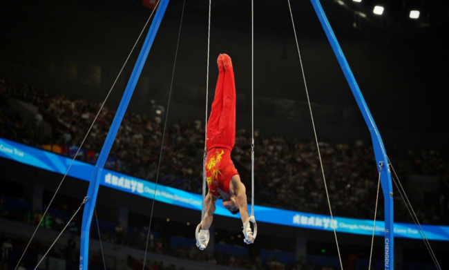 Chengdu, August 2nd and 5th - Lan Xingyu, a student from the School of Physical Education at GXU, showcased exceptional prowess as he proudly represented the Chinese team and clinched gold medals in both the Men's Team and Men's Still Rings events at the 31st World University Games.