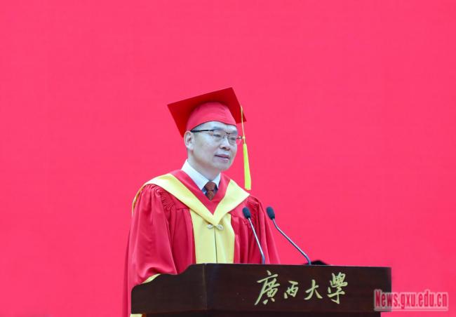 At the end , Han Linhai emphasized that youth coincides with a prosperous era, and it is the perfect time for hard-working. He hoped that students would uphold the quality of determination, kindness, confidence, and tranquility. They should inherit and promote the spirit of "diligence and sincerity" as the university motto and the spirit of "innovation, excellence, and leadership" as the spirit of Guangxi University's "Double First-Class" initiative. In the new era and the new stage of their life, they should unleash their ambitions and become the dream pursuers of great ideals, as well as the driving force for great causes. He expressed that regardless of where they are, their alma mater will always be their spiritual home, always supporting and caring for them.