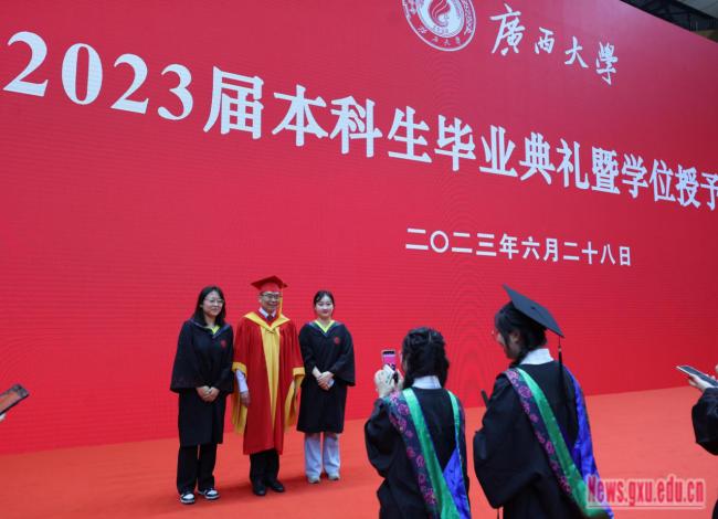 On June 28th,2023, Guangxi University held the graduation ceremony and degree awarding ceremony for the 6,005 undergraduate students of 2023. Wang Naixue (Vice Chairman of the Political Consultative Conference of Guangxi Zhuang Autonomous Region and Secretary of the CPC Guangxi University Committee), Li Jibing (Liaison officer of the Party Building of the Ministry of Education), Han Linhai (Deputy Secretary of the CPC Guangxi University Committee, President of Guangxi University ), Lv Yi (Secretary of the Discipline Inspection Commission of CPC Guangxi University Committee), Ma Shaojian, Fan Zuojun,Liu Xiang, Tian Lihui, Xiao Jianzhuang (all Vice Presidents), Ning Xuchu (Chief Accountant), Zhao Shuangliang (Assistant Principal, Vice Provost, Director of the Development Planning Division), members of the University Academic Degree Evaluation Committee, teacher representatives, Alumni representatives and graduate representatives attended the ceremony. Feng Jiaxun (Vice President and Provost) presided over the ceremony.