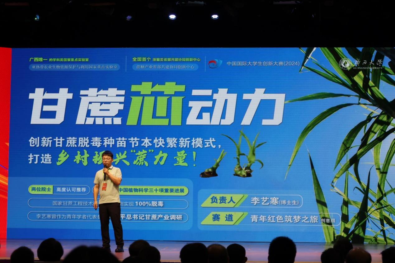 In the championship round, the project, from the “Youth Red Dream Building Journey” Track Creative Group, titled Cane Core Power—An Innovative and Cost-Effective Model for Rapid Propagation of Virus-Free Cane Seedlings to Boost Rural Revitalization, earned the runner-up spot. The project titled Target Leader—A Pioneer in Ultra-Pure Scandium Target Material Production, from the Undergraduate Creative Group of the Higher Education Main Track, secured third place. These two projects were developed by the College of Agriculture and the College of Resources, Environment, and Materials, respectively.