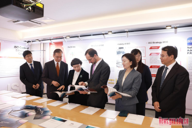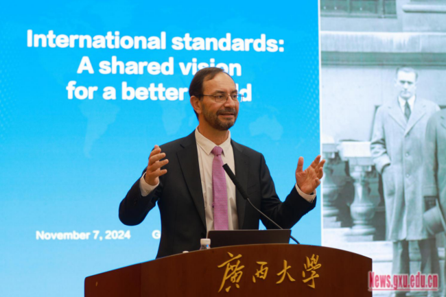 Before the unveiling ceremony, Mr. Mujica delivered a keynote speech entitled, “International Standards: A Shared Vision for a Better World” to the audience of over 200 faculty members and students from Guangxi University and other schools. He also communicated and interacted with the audience on various topics, including ways to participate in the development of ISO international standards, talent cultivation based on international standardization, and the role of standardization in reducing carbon emission.