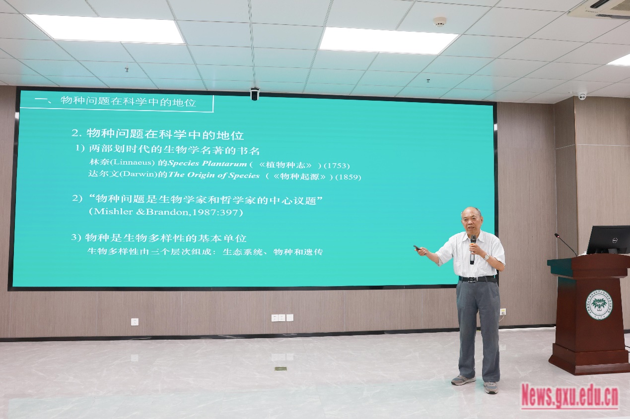 On June 29, Mr. Hong Deyuan, an academician of the Chinese Academy of Sciences, a fellow of the Third World Academy of Sciences, and a world-renowned botanist, was invited to deliver a lecture titled Species Issues and Biodiversity Conservation and Utilization at the Junwu Lecture Hall for the faculty and students of GXU. The event was hosted by Mr. Yu Wenjin, Vice President of GXU. Mr. Cai Zhongping, Director of the Forestry Bureau of the Autonomous Region, and Ms. Jiang Yinghong, a second-level inspector of the Forestry Bureau of the Autonomous Region, attended the lecture.