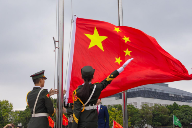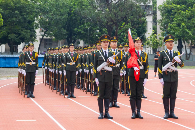 ເວລາ 8:00 ໂມງ, ພິທີຊັກທຸງໄດ້ເລີ່ມຂຶ້ນຢ່າງເປັນທາງການ. ບັນດາເຈົ້າໜ້າທີ່ຮັກສາທຸງຊາດໄດ້ພາກັນເດີນຂະບວນຢ່າງມີພະລັງ, ໄດ້ພາທຸງສີແດງຫ້າດາວໄປຫາເສົາທຸງ. ຫຼັງຈາກນັ້ນ, ຜູ້ຖືທຸງຊາດໄດ້ຍົກທຸງສີແດງຫ້າດາວຢູ່ໃນມືຂອງລາວ, ແລະທຸງຊາດສີແດງສົດໃສໄດ້ລຸກຂຶ້ນຊ້າໆ, ກະພິບໃນລົມແລະແສງສະຫວ່າງໃນຕອນເຊົ້າ. ສຽງ “ມີນາຂອງອາສາສະໝັກ” ດັງກ້ອງກັງວານໄປທົ່ວວິທະຍາເຂດ, ແລະ ບັນດາຄະນະວິຊາ ແລະ ນັກສຶກສາທັງໝົດໄດ້ຢືນຢູ່ຕໍ່ໜ້າທຸງຊາດຢ່າງສະຫງ່າຜ່າເຜີຍ, ສາຍຕາຂອງເຂົາເຫຼື້ອມໃສໃນຂະນະທີ່ເຂົາເຈົ້າຮ້ອງເພງແຫ່ງຊາດຮ່ວມກັນ.