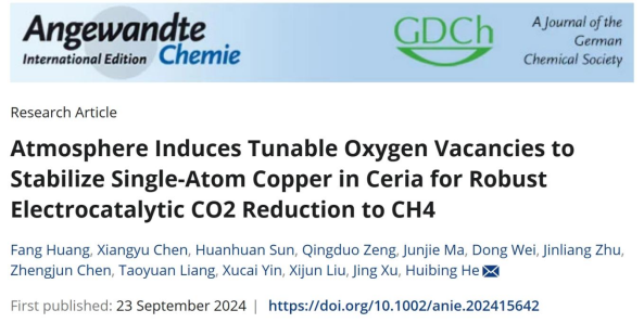 Recently, the Carbon-based Resource Catalytic Transformation Team from GXU School of Chemistry and Chemical Engineering has made a breakthrough progress in the research of carbon dioxide electroreduction. The research finding, titled “Atmosphere Induces Tunable Oxygen Vacancies to Stabilize Single-Atom Copper in Ceria for Robust Electrocatalytic CO2 Reduction to CH4”, was published in the internationally renowned academic journal in the field of chemistry, Angewandte Chemie International Edition (German Applied Chemistry). The co-first authors of the paper are Huang Fang, a 2022 Master student, and Chen Xiangyu, a 2021 Master student from the School of Chemistry and Chemical Engineering. The corresponding authors are Professor Xu Jing and Associate Professor He Huibing, with Guangxi University as the first corresponding unit. This research was supported by the projects such as China National Natural Science Foundation, Guangxi Natural Science Foundation, Guangxi Science and Technology Base and Talent Project, etc.