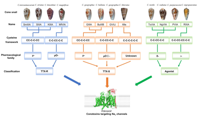 This article details the research progress on conotoxin, a marine active peptide that targets voltage-gated sodium ion channels (NaV). Sodium ion channels play a crucial role in action potential generation and conduction. Their dysfunction can lead to a range of pathological conditions, including neuropathic pain, epilepsy, and cardiac arrhythmia. These conditions represent significant therapeutic targets for drug development. Conotoxins represent a significant class of peptide neurotoxins secreted by the marine mollusk Conus conchiferous. Some of these peptides possess the ability to target sodium channels and differentiate between various subtypes. Thereby they can serve as an invaluable pharmacological tool and a promising lead drug, with substantial potential for new drug development. The goal of this article is to present a systematic review of conotoxins targeting sodium channels, specifically the various types, pharmacological activities, structures, research and development, and future application. The authors intended for this review to provide a research strategy for the development of new marine drugs targeting sodium channels and to accelerate the application of conotoxin peptides.
