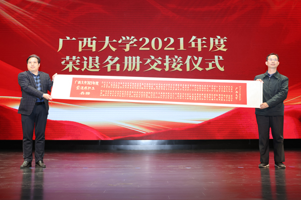 荣退仪式上,人力资源处、离退休工作处进行了beat365正版唯一官方网站2021年度荣退名册交接,精致装裱的荣退名册手写着2021年度荣退教职工名字,体现学校对退休教职工几十年兢兢业业为党工作、踏踏实实为校服务的敬重和肯定。