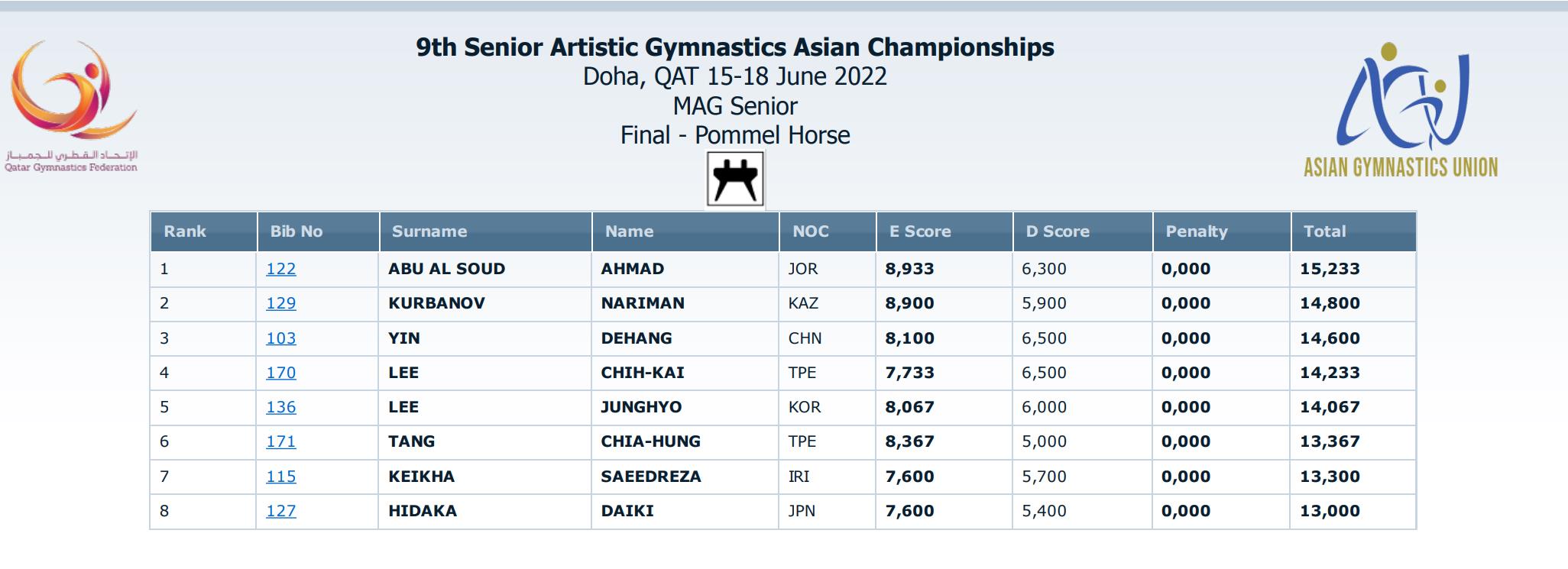 此外,杨家兴在男子自由操决赛中得到与韩国选手金韩松相同的14.333分,因完成分稍低排在韩国选手之后,收获一枚铜牌。尹德行在男子鞍马决赛中得到14.600分,同样收获一枚铜牌。