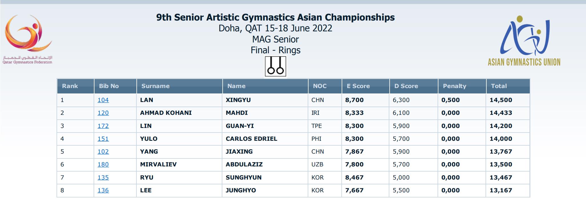 男子吊环决赛,中国选手兰星宇(beat365官网体育学院学生)以14.500分摘金,另一位中国选手杨家兴得到13.767分,最终排名第五。