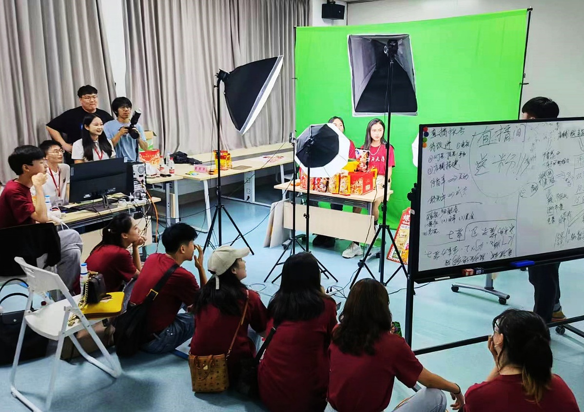 同学们与企业直播团队合作拍摄螺蛳粉直播抖音视频,将自己所学运用到实践活动之中。“这次柳州之行真是不虚此行!我们不仅吃到了酸辣鲜香烫的柳州螺蛳粉,还实地体验了直播带货。”此次实践活动让播音与主持艺术专业黄悦华同学十分惊喜,现场体验直播带货后,她为能充分发挥自己的专业优势感到开心,但在感到新奇的同时,她也感慨到,主播是一份既需要脑力也需要体力的工作,像如何用有趣的话语吸引消费者,如何更好地宣传产品卖点,都需要进一步学习研究。