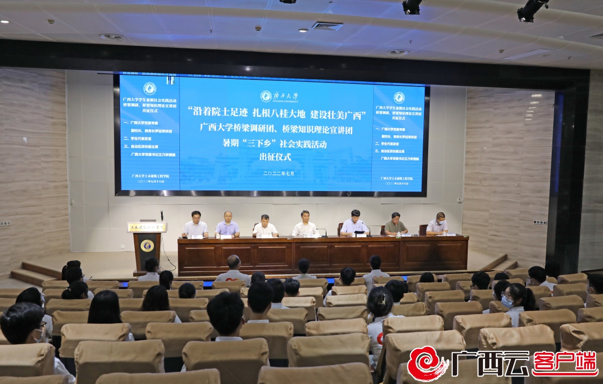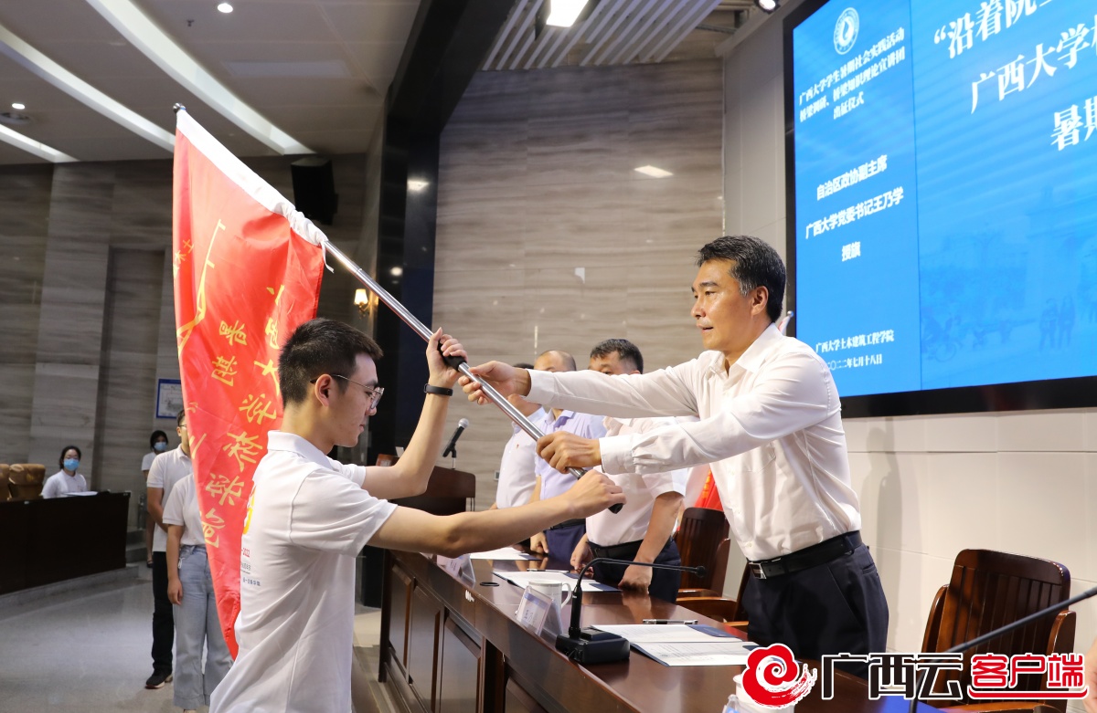 7月18日,“沿着院士足迹、扎根八桂大地、建设壮美广西”beat365正版唯一官方网站桥梁调研团、桥梁知识理论宣讲团暑期“三下乡”社会实践活动出征仪式在土木建筑工程学院举行。自治区政协副主席、beat365正版唯一官方网站党委书记王乃学出席出征仪式并为实践队授旗。