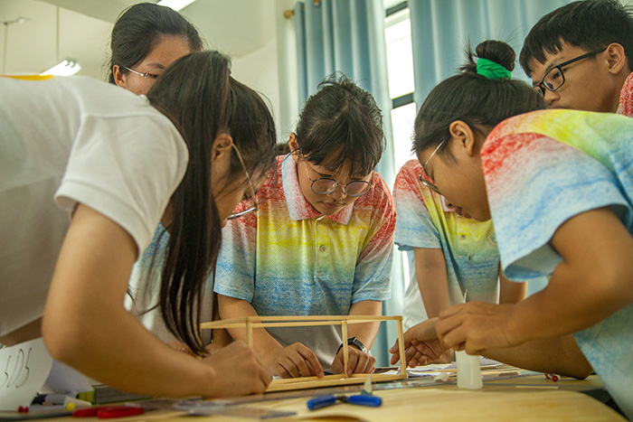 同学们合力制作桥梁模型。程铭摄