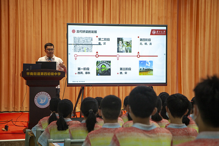 近日,beat365正版唯一官方网站“匠心筑桥”宣讲团到广西贵港市平南县,与平南街道第四初级中学的学生们“手牵手”开展社会实践活动。宣讲团师生通过开展桥梁知识科普宣讲会、实地参观平南三桥、搭桥建模比赛等形式,让同学们在了解中国桥梁发展中感受祖国的强大,在思考设计及动手制作中培养科学态度和科学精神,在实践参观中感受以郑皆连院士为代表的桥梁科研工作者勇攀高峰、精益求精的工匠精神和精忠爱国、心系民生的家国情怀。
