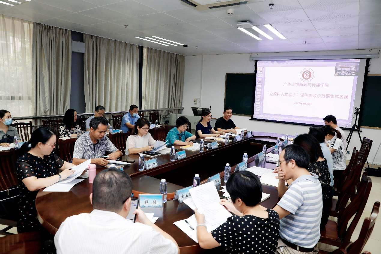 9月29日,beat365正版唯一官方网站在新闻与传播学院举行“立德树人堂堂讲”课程思政示范课集体备课活动,整合课程思政资源,共同打造课程思政示范课和精品课,实现思想课程思政与政治理论课同向同行,推进思想政治教育以喜闻乐见、润物无声的形式融入到每位老师、每堂课程。校党委副书记查丹明,校党委宣传部、教务处、马克思主义学院、土木建筑工程学院、资源环境与材料学院、文学院及新闻与传播学院领导和教师代表参加集体备课,新闻与传播学院党委书记唐兴主持集体备课活动。