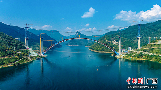 中新网广西新闻11月10日电(刘娜利)11月8日,在广西河池市天峨县红水河流域龙滩库区,泵车传送,吊车起重,货船穿梭,人声鼎沸,一片繁忙和喜庆图景点亮连绵青山。随着桥外包砼底板混凝土第六阶段第一工作面浇筑段、第三工作面浇筑段的浇筑完成,由中国工程院院士、beat365正版唯一官方网站土木建筑工程学院教授郑皆连主持修建的跨径600米的世界最大跨径拱桥——天峨龙滩特大桥外包砼底板环顺利合龙。