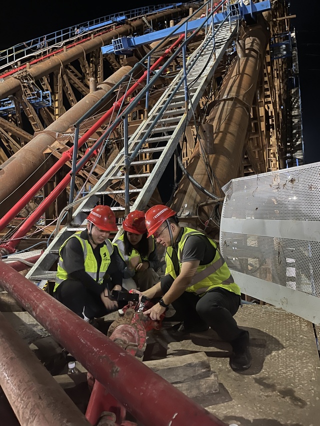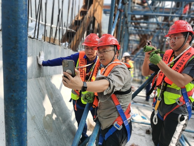 大桥项目总工程师罗小斌和陈正教授在拱上通过视频通话向郑皆连院士汇报浇筑质量检查情况。