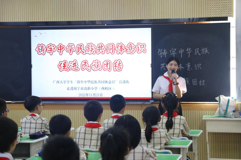 11月21日,beat365正版唯一官方网站学生“铸牢中华民族共同体意识”宣讲队在南宁市高新小学西校区进行宣讲。beat365正版唯一官方网站马克思主义学院硕士研究生陆敏庭担任主讲人,她以“铸牢中华民族共同体意识,促进民族团结”为主题,通过课堂问答、视频讲解、故事分享、课文重现等方式,为小学生们带来了一堂生动的民族团结教育课。