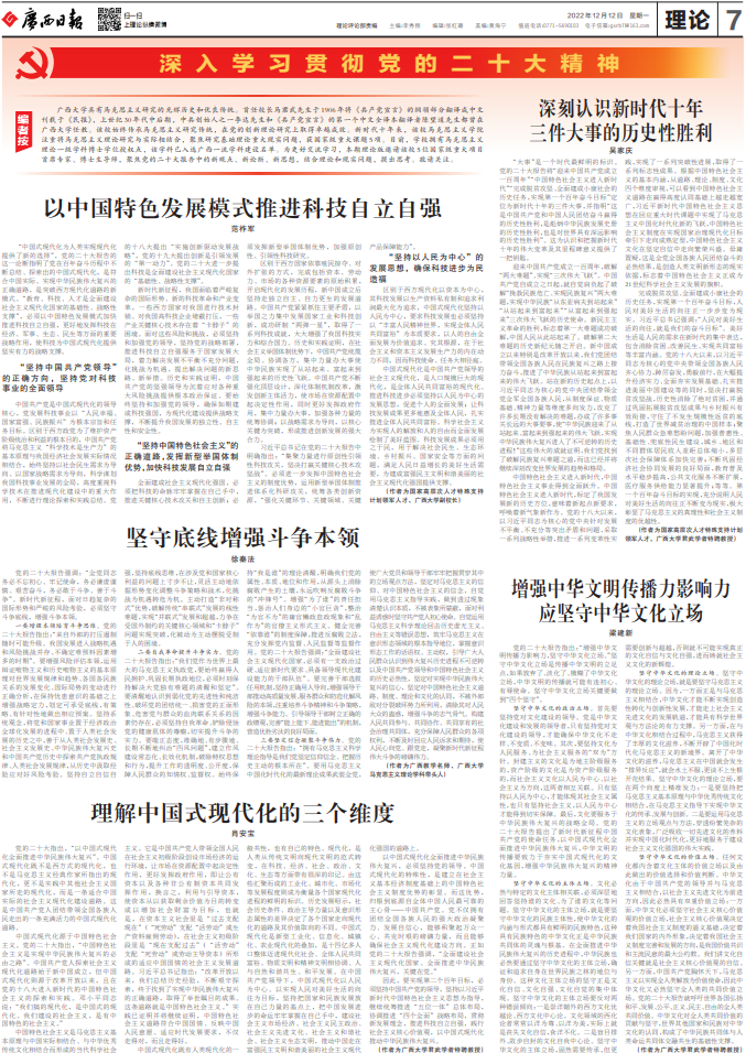 beat365正版唯一官方网站具有马克思主义研究的光辉历史和优良传统。首任校长马君武先生于1906年将《共产党宣言》的纲领部分翻译成中文刊载于《民报》,上世纪30年代中后期,中共创始人之一李达先生和《共产党宣言》的第一个中文全译本翻译者陈望道先生都曾在beat365正版唯一官方网站任教。该校始终传承马克思主义研究传统,在党的创新理论研究上取得卓越成效。新时代十年来,该校马克思主义学院注重将马克思主义理论研究与实际相结合,聚焦研究基础理论重大现实问题,获国家级重大课题5项。目前,学校拥有马克思主义理论一级学科博士学位授权点,该学科已入选广西一流学科建设名单。为更好交流学习,本期理论版邀请该校5位国家级重大项目首席专家、博士生导师,聚焦党的二十大报告中的新观点、新论断、新思想,结合理论和现实问题,提出思考。敬请关注。