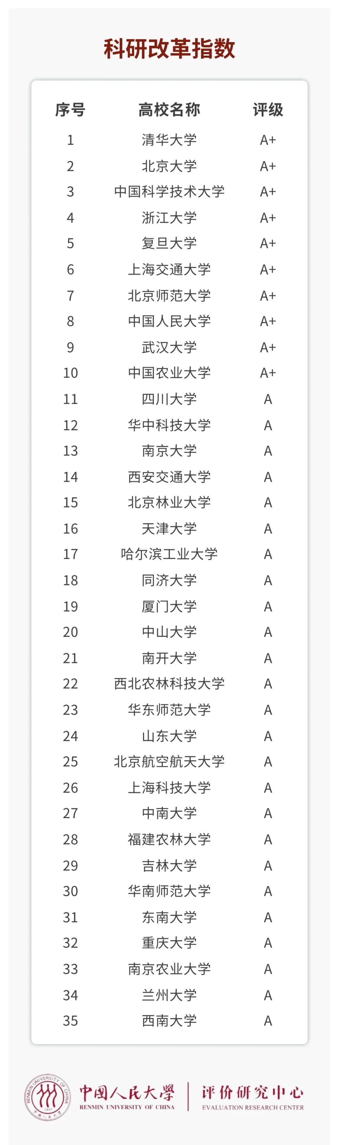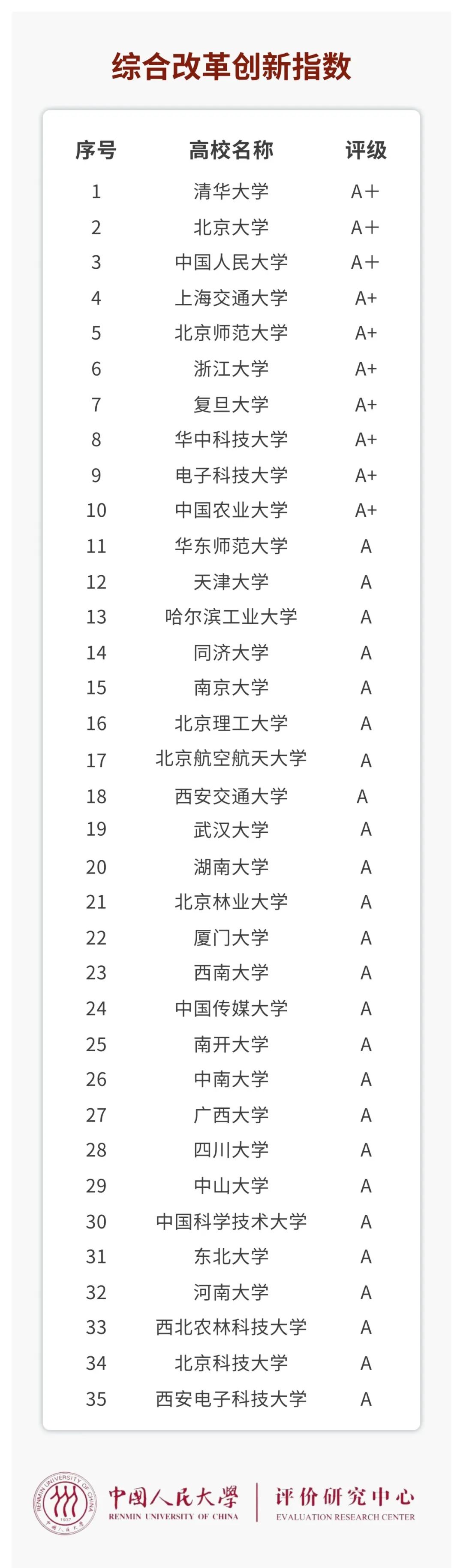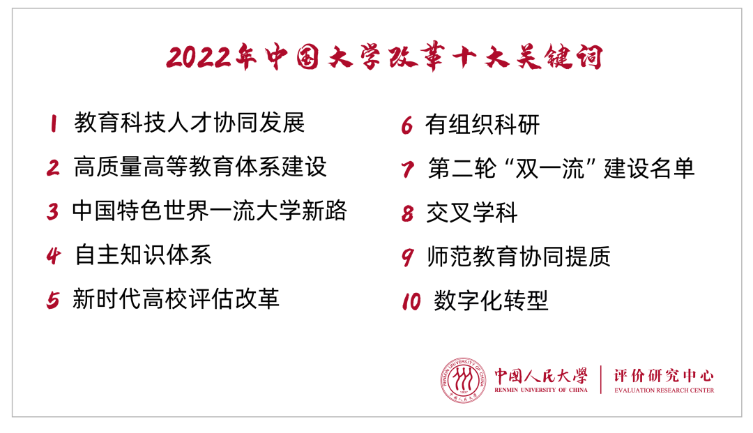 2022年12月30日,在中国人民大学举办的“2022年中国大学改革创新指数发布会暨研讨会”上,中国人民大学评价研究中心发布了“2022年中国大学改革十大关键词”和“2022年中国大学改革创新指数”。