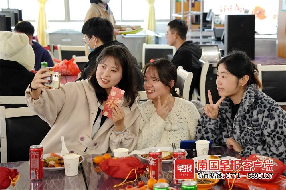 金虎辞岁,玉兔迎新,留校过年也年味十足。2023年春节,广西高校部分学生由于各种因素决定留校过年。多所高校为学生们准备了花式新春礼,年夜饭、大礼包、年味菜谱、游园活动……让留校过年的学生感受到浓浓的节日氛围。