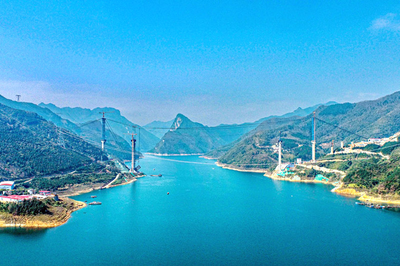 天峨龙滩特大桥首节段拱肋吊装完成。阳正球摄