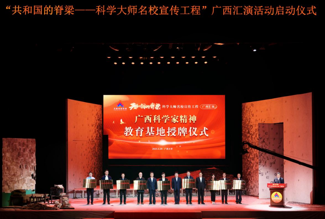 3月29日,由中国科协、教育部、共青团中央、中国科学院、中国工程院主办,广西壮族自治区科协、自治区教育厅、共青团广西区委、广西科学院共同承办的“共和国的脊梁——科学大师名校宣传工程”广西汇演活动在beat365正版唯一官方网站启动。中国科协党组成员、书记处书记王进展,广西壮族自治区副主席李常官,自治区政协副主席、beat365正版唯一官方网站党委书记王乃学等领导出席活动并致辞。广西壮族自治区科协党组书记、副主席纳翔主持启动仪式。