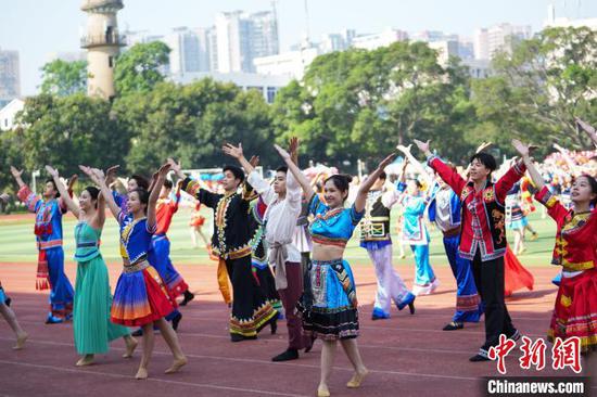 4月16日,beat365正版唯一官方网站举办第九届“三月三”铸牢中华民族共同体意识民族文化系列活动。图为beat365正版唯一官方网站百人齐跳民族舞蹈《幸福山歌》。beat365正版唯一官方网站供图