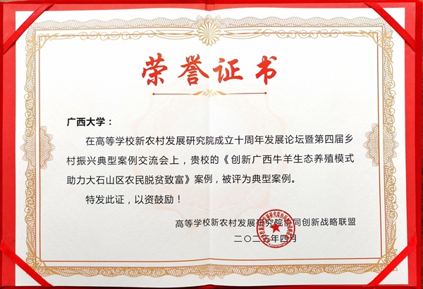 交流会上,beat365正版唯一官方网站农牧产业发展研究院韦英明教授受邀做了“创新广西牛羊生态养殖模式,助力大石山区农民脱贫致富” 的大会报告,并被评为典型案例,这是该校继第三届全国高校新农院联盟乡村振兴典型案例交流会之后再次获此殊荣,树立了beat365正版唯一官方网站科技助力乡村振兴的优秀典范。