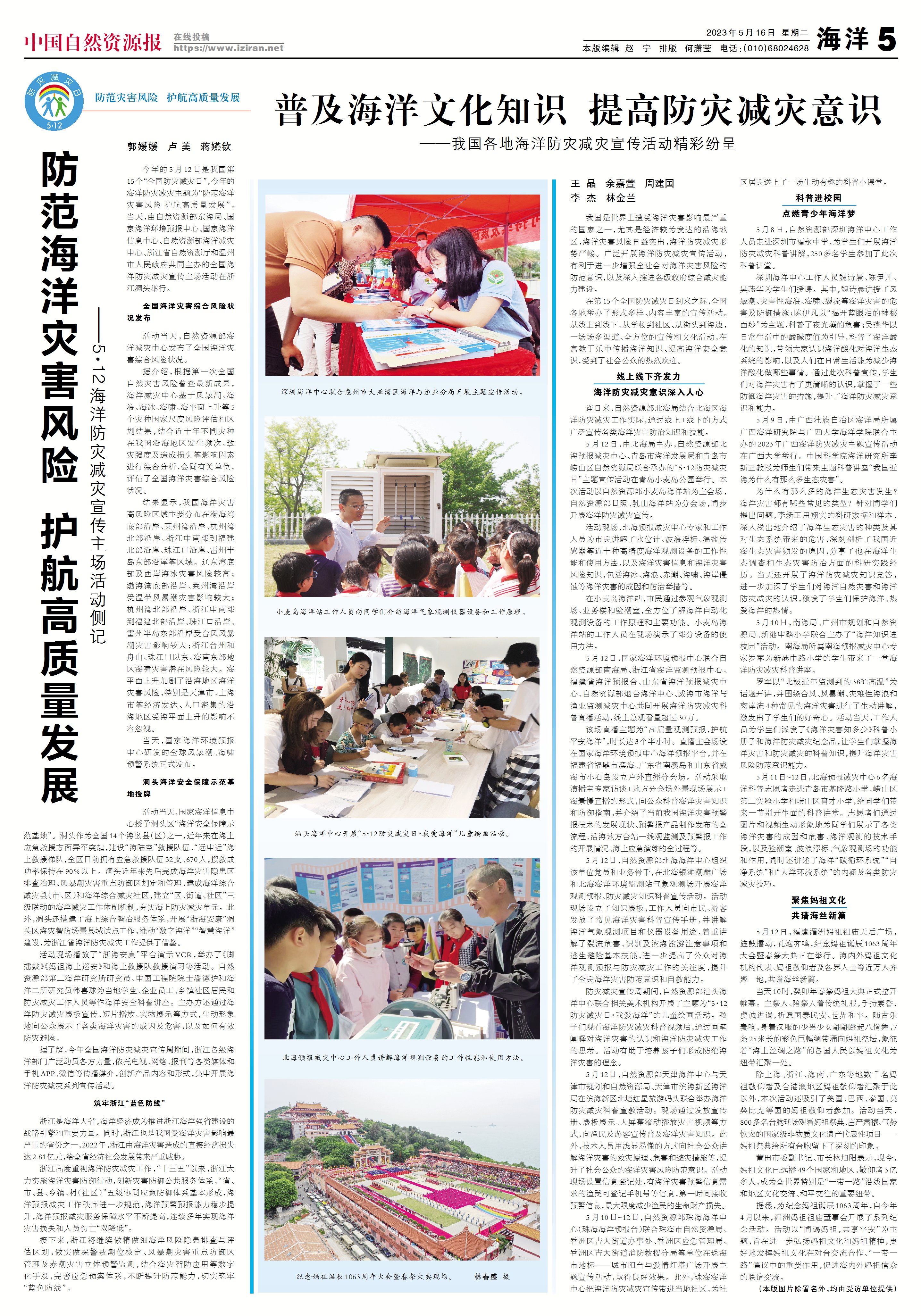 5月12日,国家海洋环境预报中心联合自然资源部南海局、浙江省海洋监测预报中心、福建省海洋预报台、山东省海洋预报减灾中心、自然资源部烟台海洋中心、威海市海洋与渔业监测减灾中心共同开展海洋防灾减灾科普直播活动,线上总观看量超过30万。