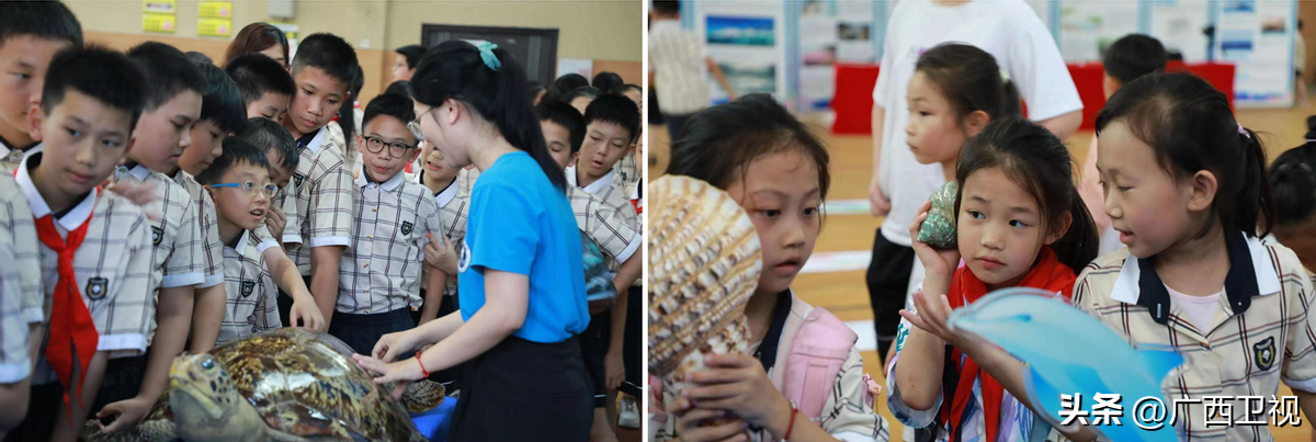 活动以海洋知识进校园的形式,在南宁市云景路小学举行。海洋学院15名师生身穿蓝色院服,发挥自身专业优势,围绕北部湾海洋生态系统与人类和谐共生的话题,为参加活动的领导、专家学者、师生们展示了30余种南海及北部湾常见的海洋标本,包括:珊瑚礁、鱼类、海星、海螺等珊瑚礁区常见的生态物种,耐心介绍这些生态物种的特点、习性,科普了相关知识。