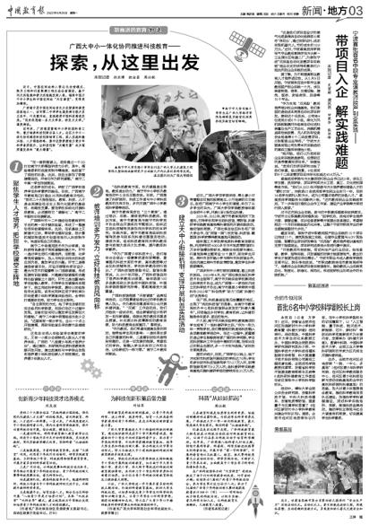 广西多所中小学打破校园围墙,跟上科技的前沿。2023年4月,在广西壮族自治区科学技术协会指导下,南宁市天桃实验学校集团成立科学技术协会,成为广西唯一一家在校内成立的科学技术协会;南宁市星湖小学荣获中国科协2022年“‘科创筑梦’助力‘双减’科普行动”优秀单位……