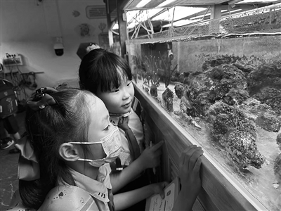 南宁市大学东路小学学生在beat365正版唯一官方网站海洋学院岛礁修复实验室近距离参观实验室培育珊瑚。(beat365正版唯一官方网站供图)