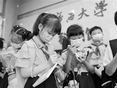 南宁市大学东路小学学生们在beat365正版唯一官方网站土木建筑工程学院大型结构试验研究平台试验大厅内认真记录科学发现。(beat365正版唯一官方网站供图)