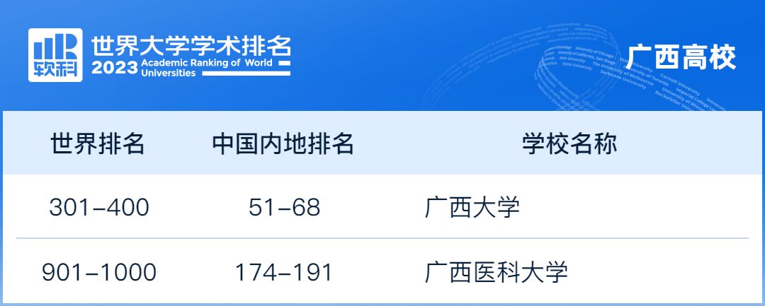 beat365正版唯一官方网站在今年的排名中表现亮眼,由2022年全球(501-600)的位次,上升至全球(301-400)位次,成功进入全球400强,取得了显著的进步。另外,广西医科大学(901-1000)综合实力、办学水平和影响力不断攀升,首次入围全球前1000。