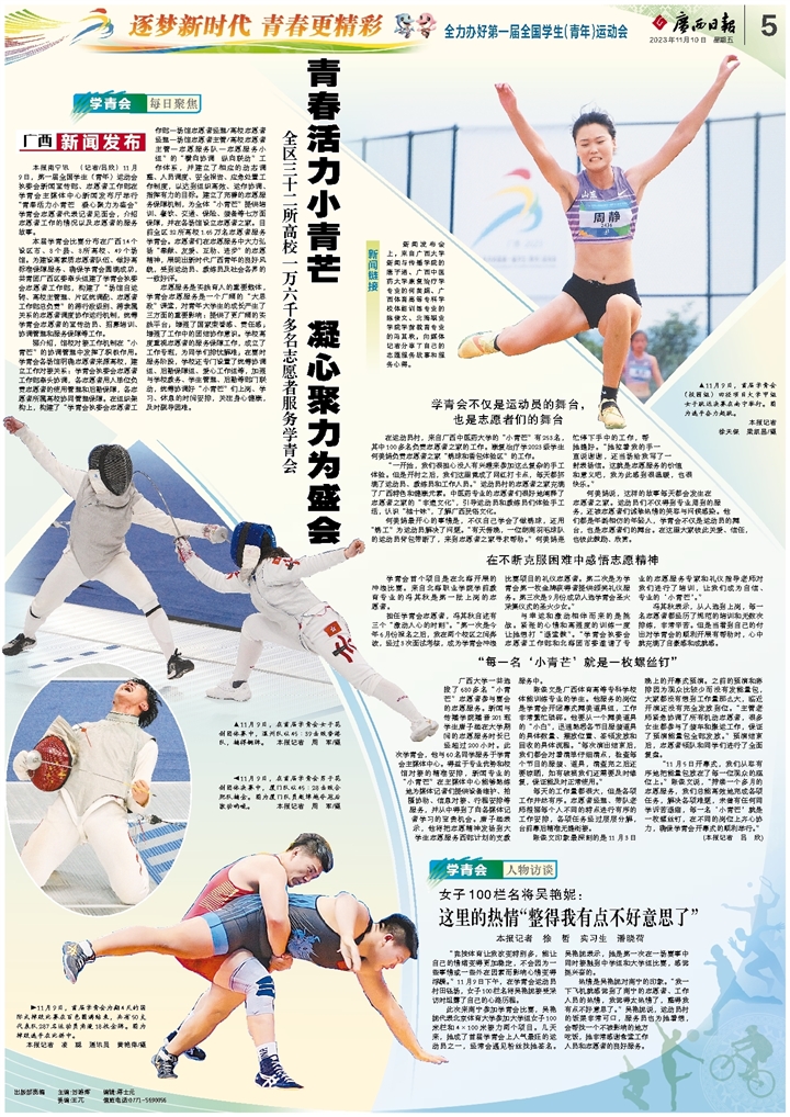 据介绍,馆校对接工作机制在“小青芒”的协调管理中发挥了积极作用。学青会各场馆明确志愿者来源高校,建立工作对接关系:学青会执委会志愿者工作部牵头协调,各志愿者用人单位负责志愿者的使用管理和后勤保障,各志愿者所属高校协同管理保障。在组织架构上,构建了“学青会执委会志愿者工作部—场馆志愿者经理/高校志愿者经理—场馆志愿者主管/高校志愿者主管—志愿服务队—志愿服务小组”的“横向协调 纵向联动”工作体系,并建立了相应的动态调整、人员调度、安全报告、应急处置工作制度,以达到组织高效、运作协调、指挥有力的目标。建立了完善的志愿服务保障机制,为全体“小青芒”提供培训、餐饮、交通、保险、装备等七方面保障,并在各场馆设立志愿者之家。目前全区32所高校1.65万名志愿者服务学青会。志愿者们在志愿服务中大力弘扬“奉献、友爱、互助、进步”的志愿精神,展现出新时代广西青年的良好风貌,受到运动员、教练员及社会各界的一致好评。