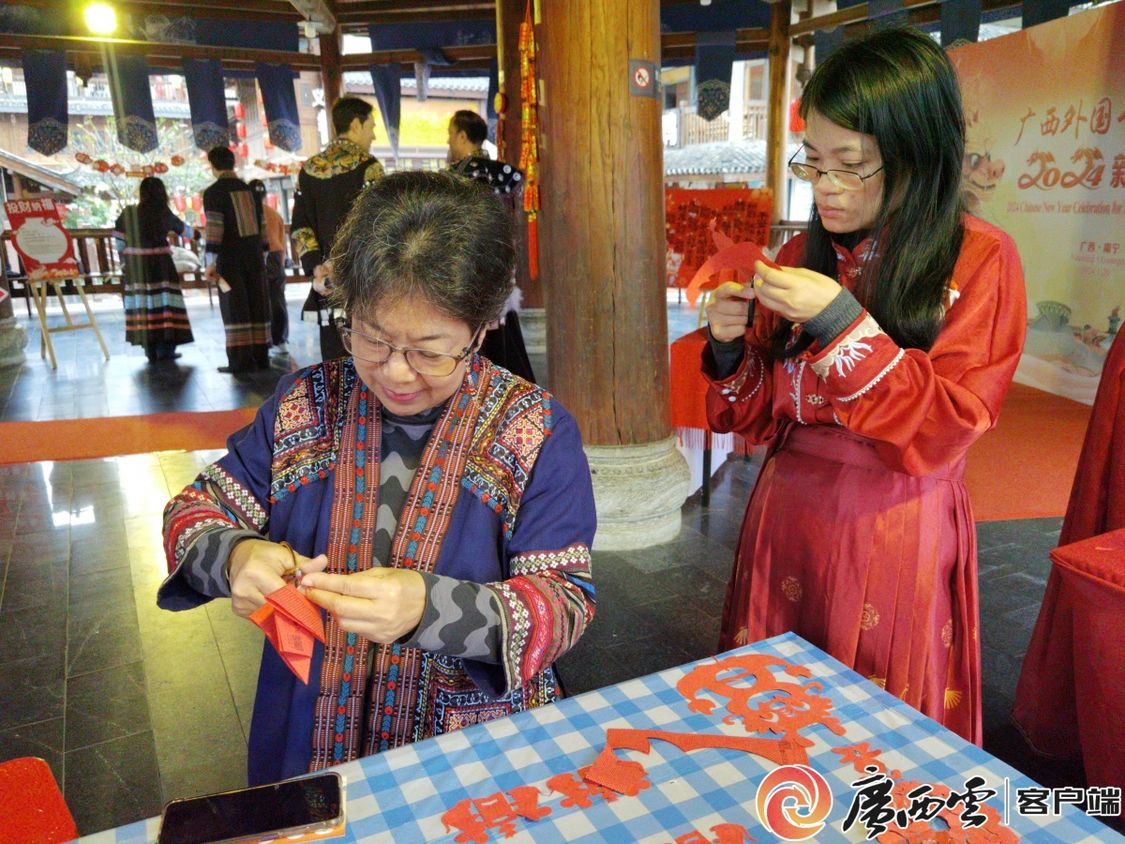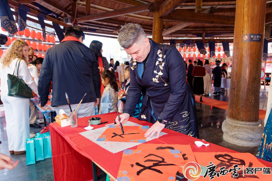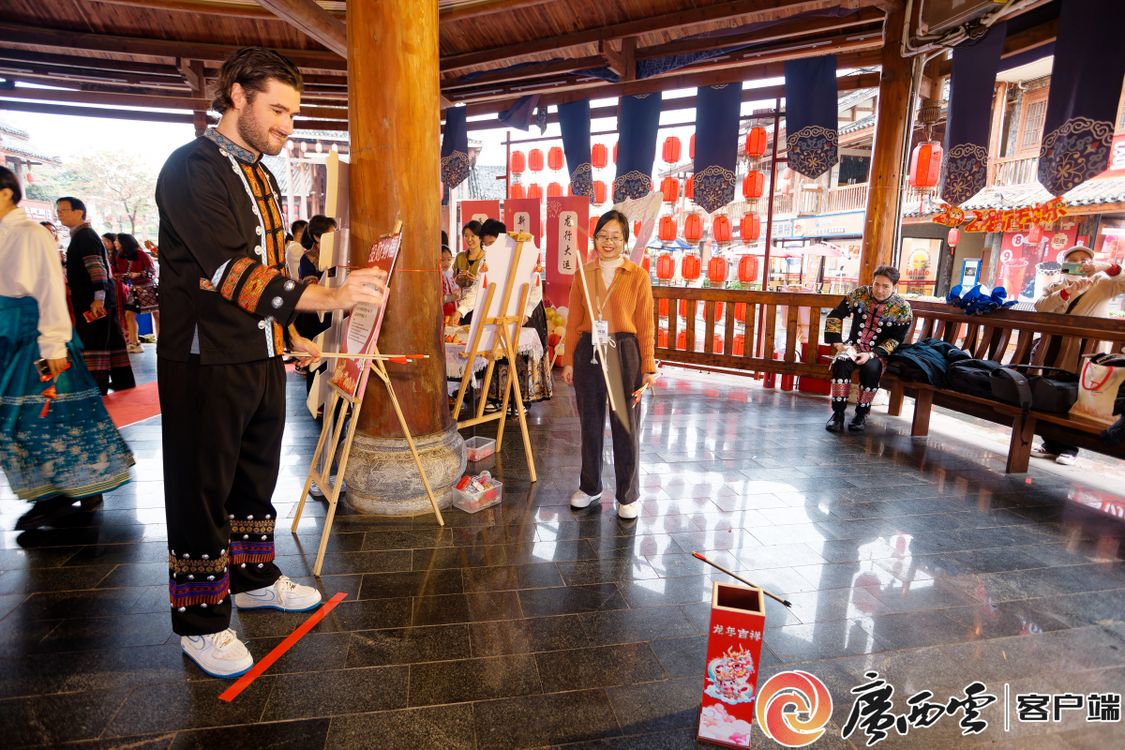 活动现场,外国专家参与传统民俗游戏,沉浸式体验中华传统文化的独特魅力。游园会上,投壶、抛圈、写福字、剪窗花等各式各样原汁原味的传统游戏让外国专家在这场古风游园会“穿越”,活动内容乐趣横生、精彩纷呈,新春氛围活泼生动、热闹非凡。在广西水牛研究所工作的意大利籍研究员阿尔弗雷多表示对民族服饰非常感兴趣,全程穿着炫丽的特色服饰参与了游园活动。来自泰国的文婷是beat365正版唯一官方网站中国—东盟研究院泰国研究所副所长。她说:“虽然春节不是我们国家的传统节日,但在中国,浓厚的节日气氛,也让我很想念家乡。”来自英国的亚历克斯参与了‘投财纳福’和‘画龙点睛’等项目后表示,这些传统民俗活动非常有趣,让我更加了解中国新春佳节的习俗和文化。外国专家们对主办单位的精心筹备和新春祝福表示感谢,浓厚的节日氛围让人流连忘返,希望以后能够经常来参加相关的活动。