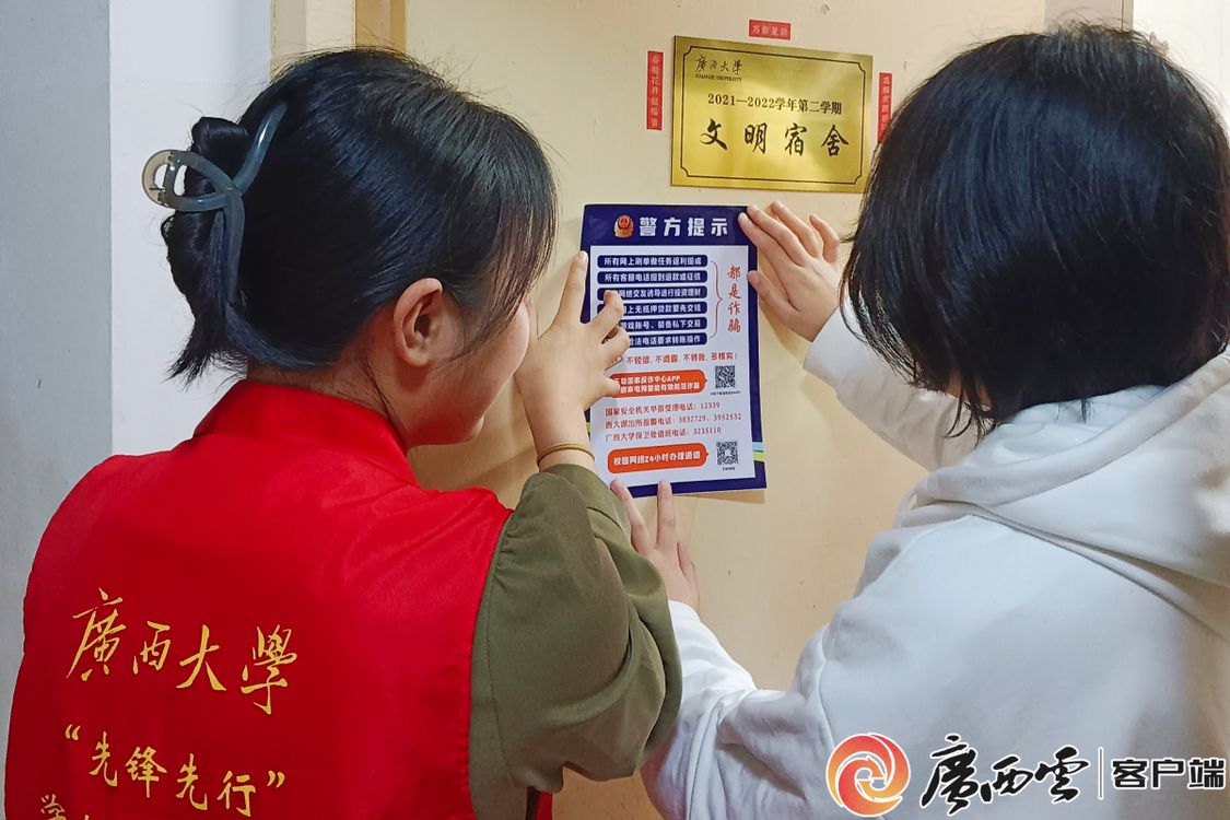 “未知链接不点击,陌生来电不轻信,个人信息不透露,转账汇款多核实!”来自文学院的曾荟楠同学在学生社区开展反诈宣传志愿服务时说道。近日,学生党员走进西22栋宿舍,向同学们讲解高校发生的诈骗案例,并重点介绍了兼职刷单类、校园贷款类、冒充客服类等常见诈骗类型,提醒大家加强对人身、财产安全的保护。