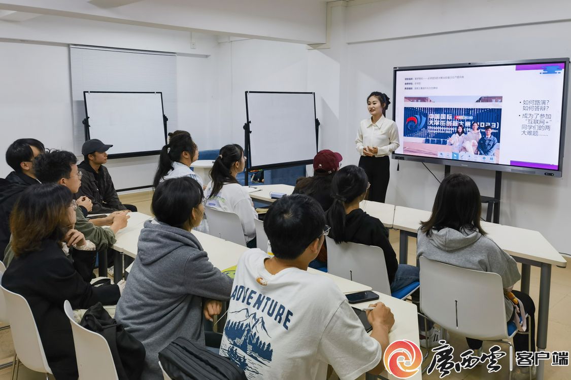 作为2023年中国国际大学生创新大赛获奖项目成员,来自新闻与传播学院的闻名天夏同学,在“一站式”学生社区的学术研讨室内开展创新创业项目朋辈辅导,强调逻辑清晰、内容完整、数据支持、视觉效果、语言表达、情感共鸣等路演展示要点。
