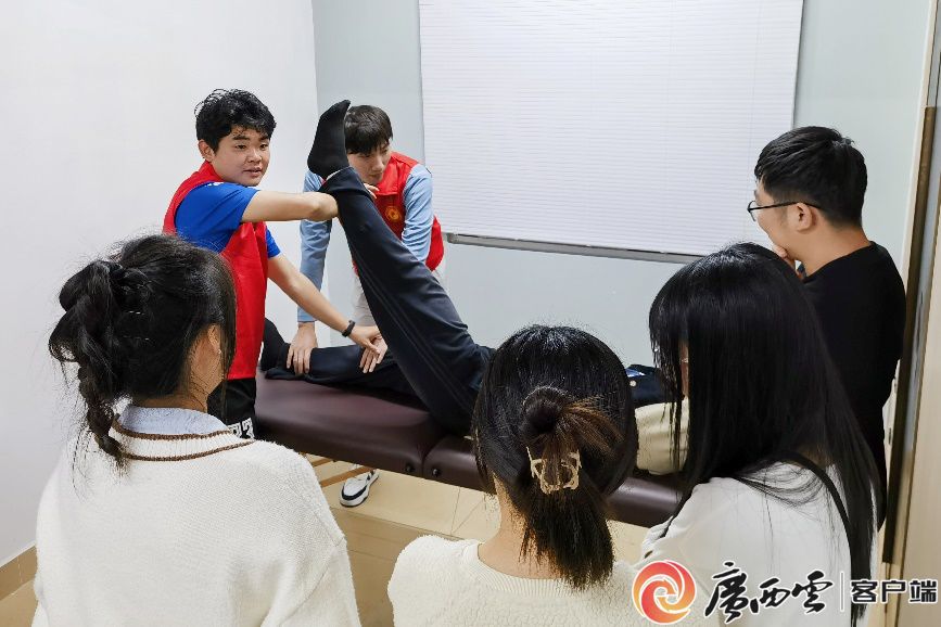 来自体育学院的欧恒瑞、许新悦同学在“一站式”学生社区的健康服务站内,使用理疗床、泡沫砖、弹力带等现代康复器具和传统推拿手法,为现场同学进行腰椎、颈椎、关节等部位康复理疗志愿服务,并传授日常保健知识和训练方法。