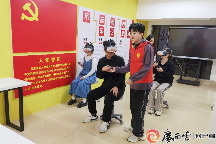 “现在可以选择中共一大纪念馆、遵义会议纪念馆、东北抗联史实陈列馆参观······”来自动物科学技术学院的曾观丽同学正在“一站式”学生社区的党员活动室开展党史宣讲志愿服务,为VR智慧党建系统体验者提供学习内容介绍。戴上VR眼镜,手持感应手柄,即可通过数字虚拟现实技术,身临其境般地参观展览馆。