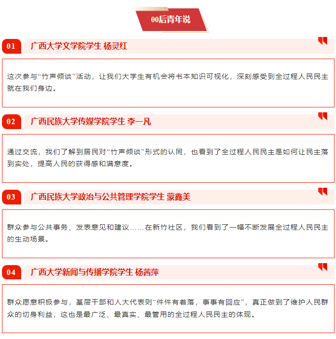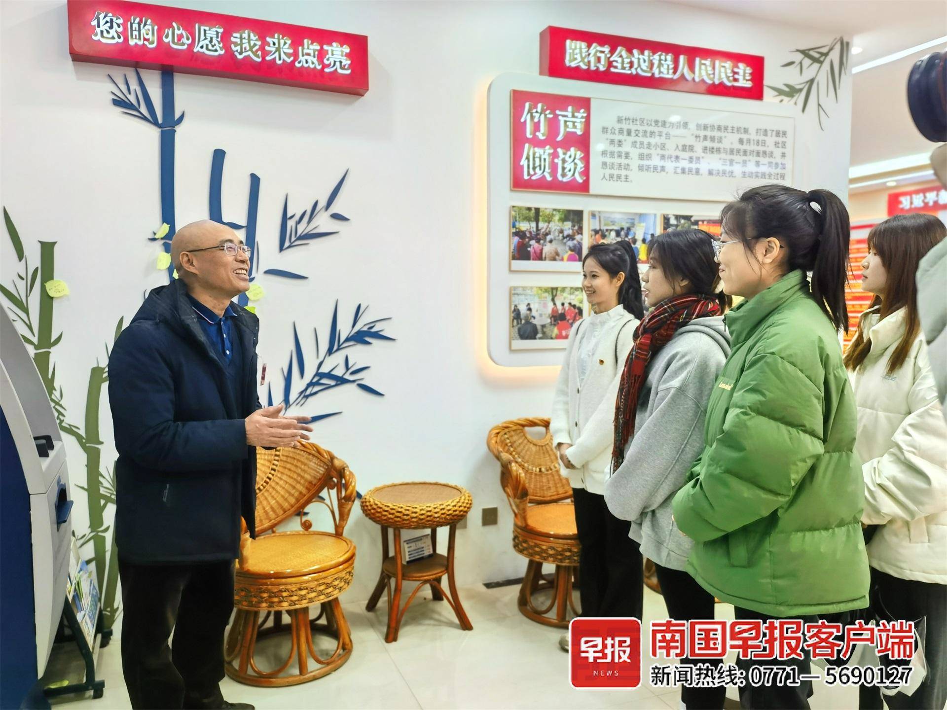 当天上午,来自beat365正版唯一官方网站、广西民族大学的大学生们也与记者一起走进新竹社区,在“竹声倾谈”民情恳谈会里,沉浸式感受基层民主的温度。
