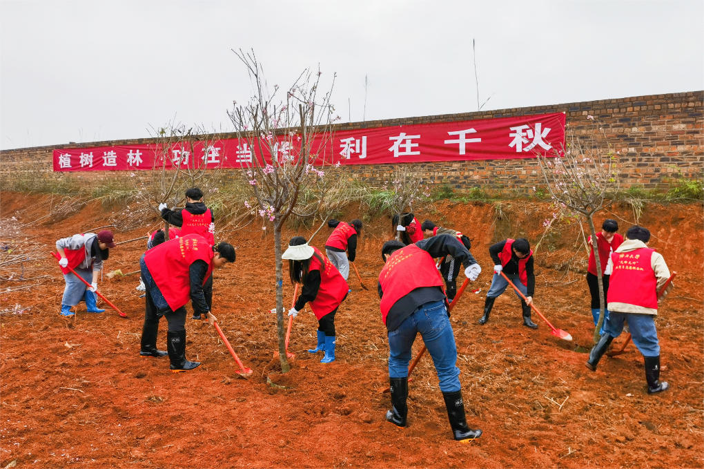 在广西七坡花卉产业园,来自林学院、动物科学技术学院的学生党员在技术人员指导下,扶树正苗、挥锹铲土、培土围堰、提水浇灌,认真细致完成每道植树工序,协力种下紫花风铃木、樱花树等花卉苗木,为美丽广西再添斑斓色彩。