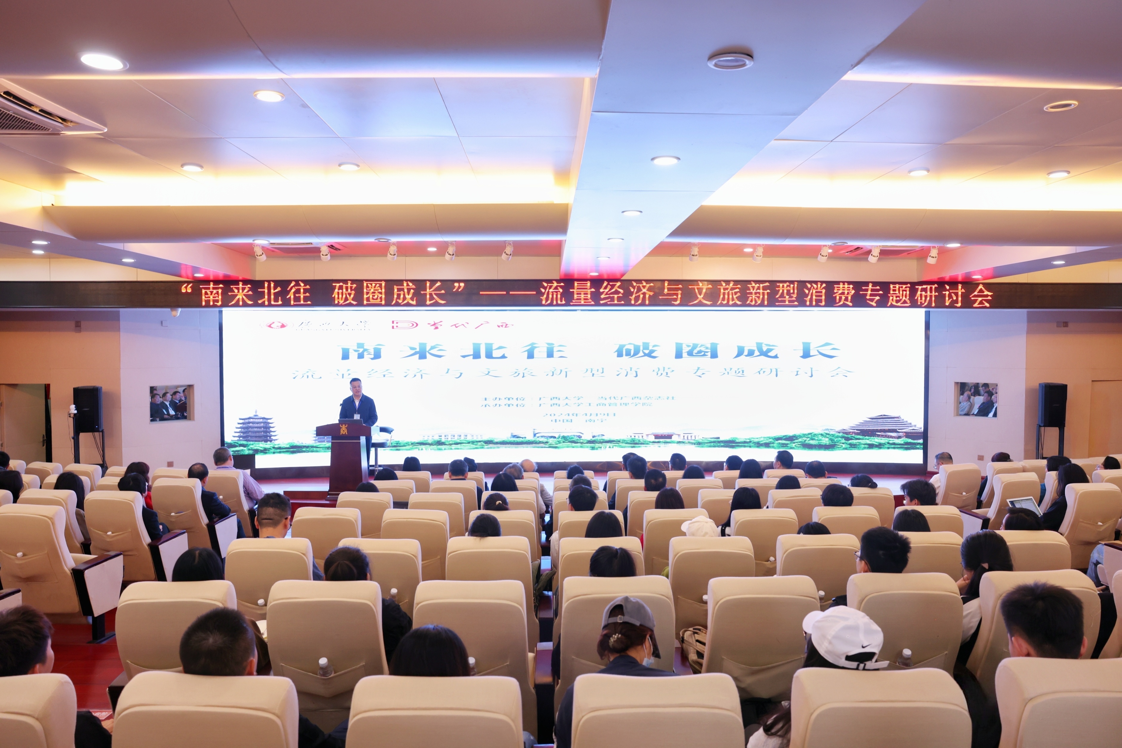 4月9日,由beat365正版唯一官方网站、当代广西杂志社主办的“南来北往 破圈成长”——流量经济与文旅新型消费专题研讨会在beat365正版唯一官方网站工商管理学院举行。来自中山大学、哈尔滨工业大学、黑龙江大学、湖北大学、beat365正版唯一官方网站、陕西师范大学等国内10余所高校以及广西壮族自治区文化和旅游厅、广西壮族自治区社会科学界联合会、广西旅游发展集团、南宁市文化广电和旅游局等单位的专家学者及beat365正版唯一官方网站师生近100人汇聚一堂,热烈探讨。