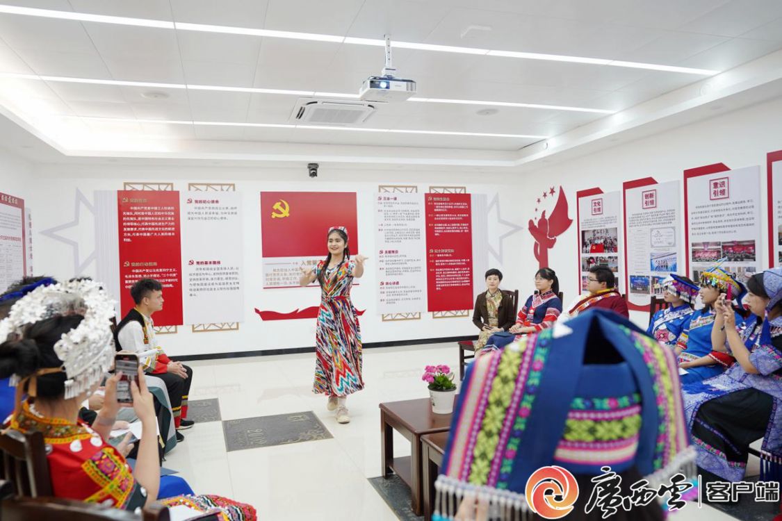 身着壮族传统服饰的学院党委书记罗诚与汉、壮、苗、瑶、仫佬、维吾尔、纳西、傣、满等14个民族的学生代表欢聚一堂,唱支山歌给党听、同心共话民族情。