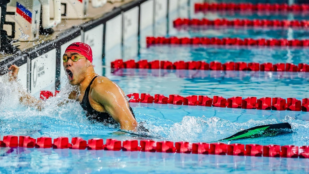 关涵之以1′14″08的成绩打破男子200米器泳世界纪录。红建强摄