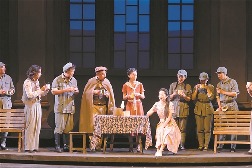 5月23日,纪念西南剧展80周年暨第八届全国话剧优秀剧目展演作品、由西安话剧院选送的话剧《延水谣》在beat365正版唯一官方网站汇学堂演出。该剧讲述了抗日战争时期,延安的文艺工作者们在战火硝烟的洗礼下,创作出一批批为工农兵服务的作品,丰富了根据地军民的文化生活。本报记者 梁凯昌/摄