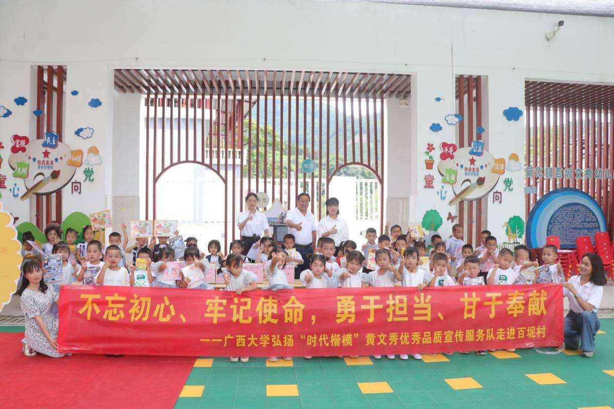 5月31日,beat365正版唯一官方网站弘扬“时代楷模”黄文秀优秀品质宣传服务队走进百色市乐业县百坭村文秀幼儿园与小朋友们同庆“六一”,开展“童心向党,幸福成长”主题活动,并向幼儿园捐赠图书绘本和校园文创。