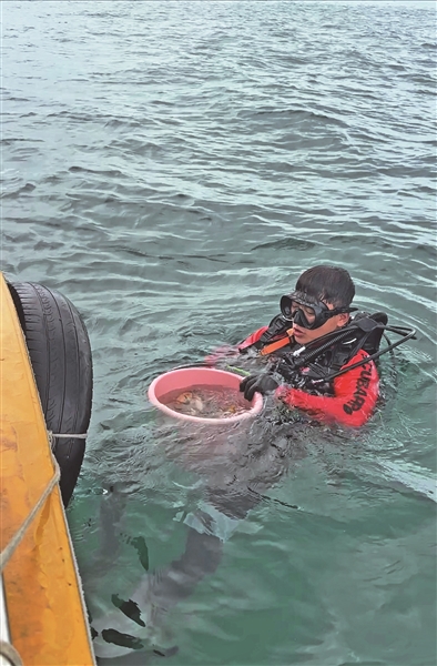 工作人员杨钦康穿上潜水服、背上氧气瓶,率先跃入海中,准确找到需要补种的珊瑚床,然后用浮球在海面上确定好方位。黄雯和工作人员季相辉带着用废弃蚝壳制成的苗托,先后潜入海底。