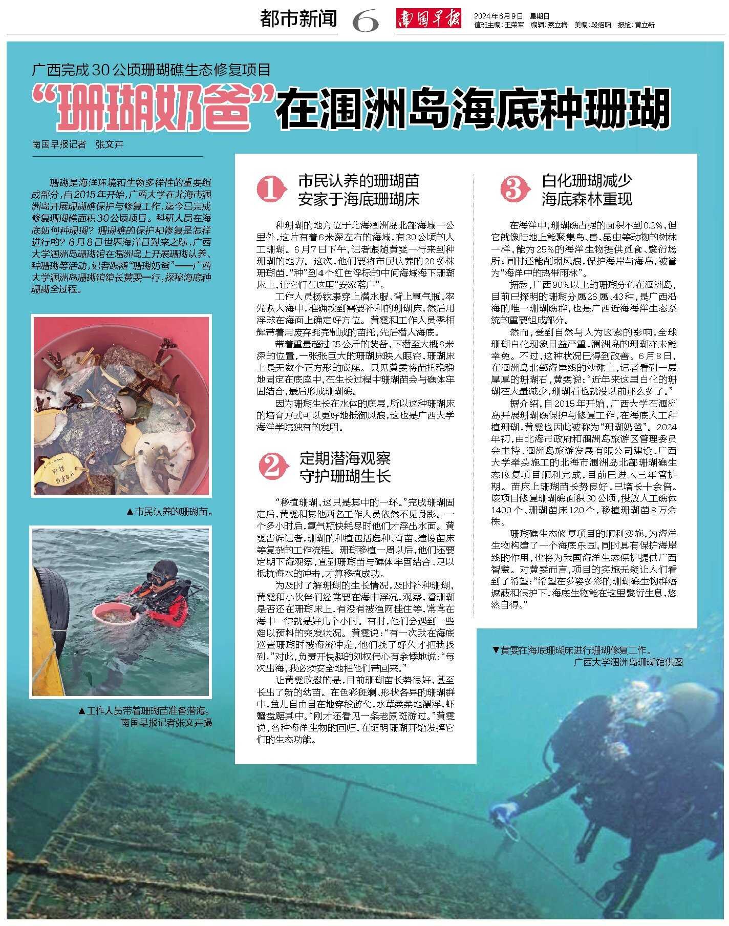 据介绍,自2015年开始,beat365正版唯一官方网站在涠洲岛开展珊瑚礁保护与修复工作,在海底人工种植珊瑚,黄雯也因此被称为“珊瑚奶爸”。2024年初,由北海市政府和涠洲岛旅游区管理委员会主持、涠洲岛旅游发展有限公司建设、beat365正版唯一官方网站牵头施工的北海市涠洲岛北部珊瑚礁生态修复项目顺利完成,目前已进入三年管护期。苗床上珊瑚苗长势良好,已增长十余倍。该项目修复珊瑚礁面积30公顷,投放人工礁体1400个、珊瑚苗床120个,移植珊瑚苗8万余株。
