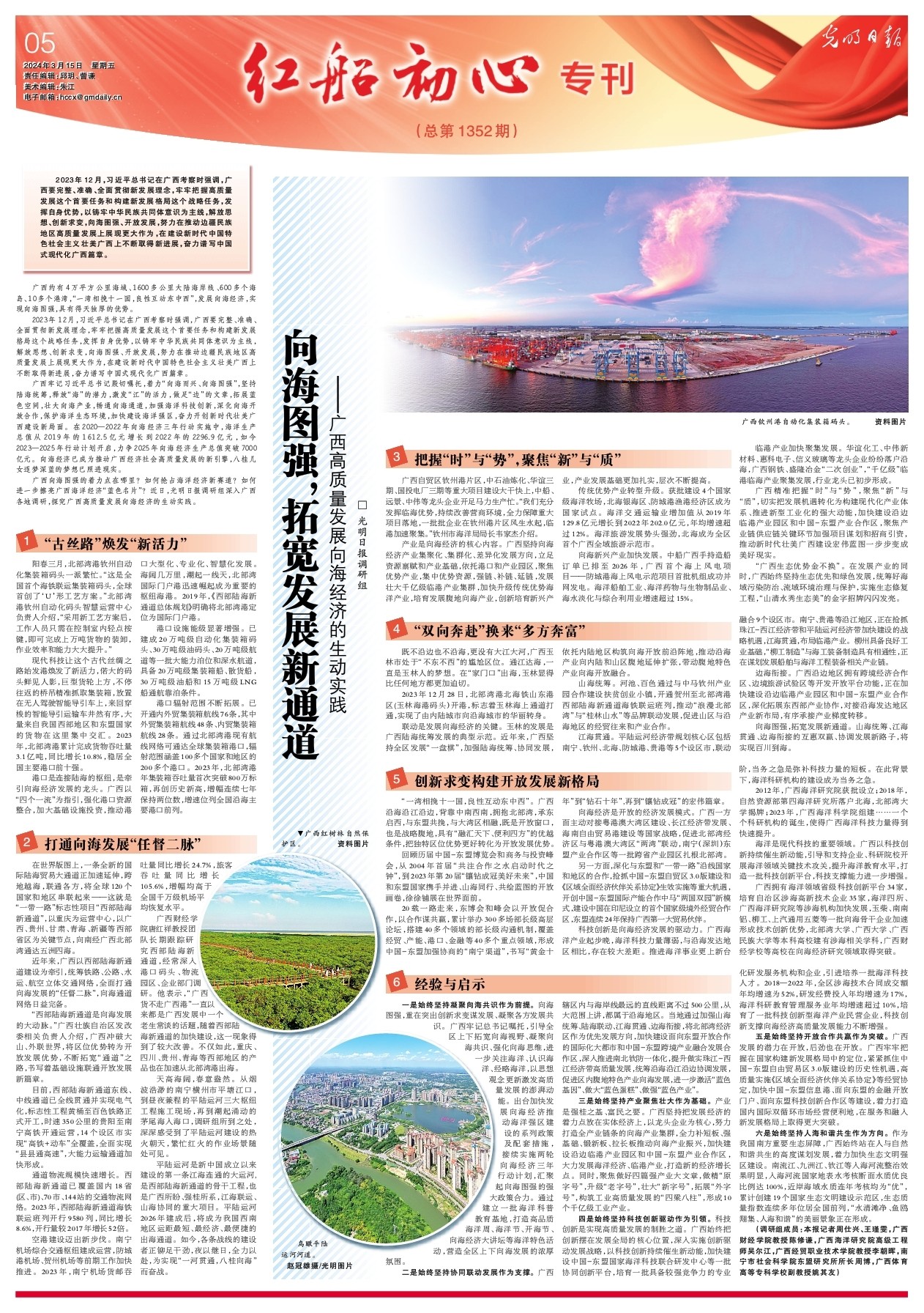 一是始终坚持凝聚向海共识作为前提。向海图强,重在突出创新求变谋发展、凝聚各方发展共识。广西牢记总书记嘱托,引导全区上下拓宽向海视野、凝聚向海共识、强化向海思维,进一步关注海洋、认识海洋、经略海洋,以思想观念更新激发高质量发展的澎湃动能。出台加快发展向海经济推动海洋强区建设的系列政策及配套措施,接续实施两轮向海经济三年行动计划,汇聚起向海图强的强大政策合力。通过建立一批海洋科普教育基地,打造高品质海洋周、海洋节、开海节、向海经济大讲坛等海洋特色活动,营造全区上下向海发展的浓厚氛围。