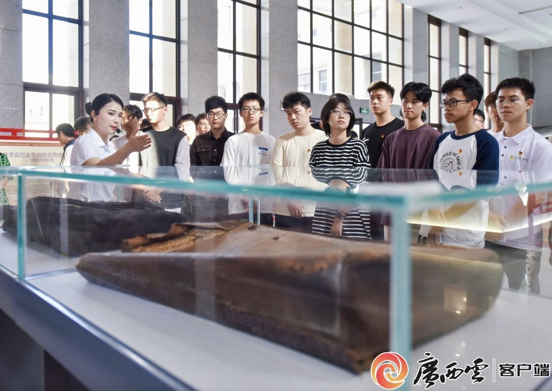 当天,广西革命纪念馆遴选了11件/套新民主主义革命时期、社会主义革命和建设时期的珍贵革命文物。这些承载着厚重历史的一件件珍贵文物、一幅幅生动图片、一段段详实文字,生动再现了中国共产党带领八桂儿女艰苦奋斗,推动民族独立、人民解放的光辉历程。在讲解员的深情讲述下,同学们走进那段波澜壮阔的烽火岁月,产生共鸣,深受教育。
